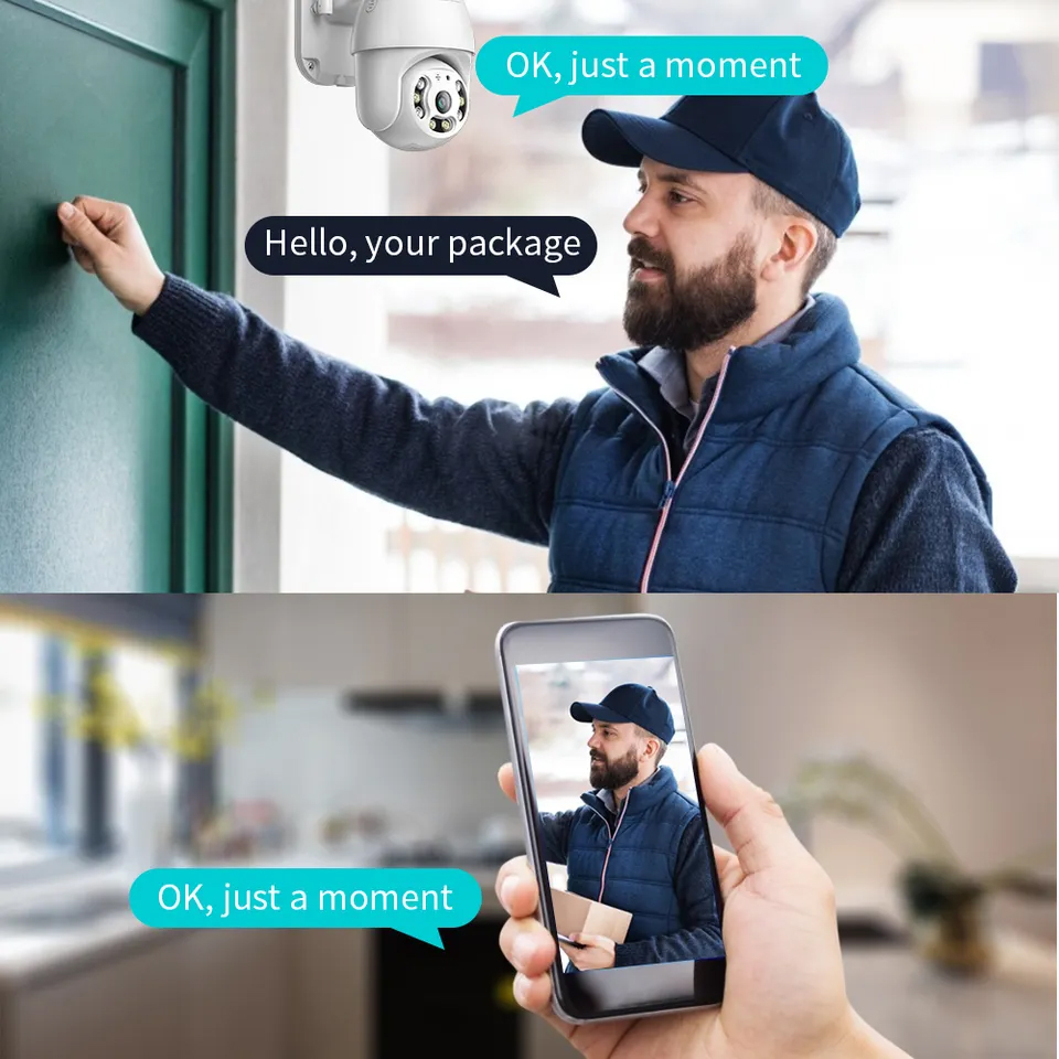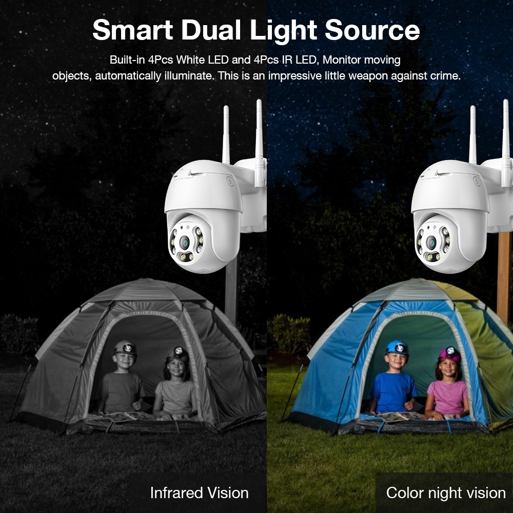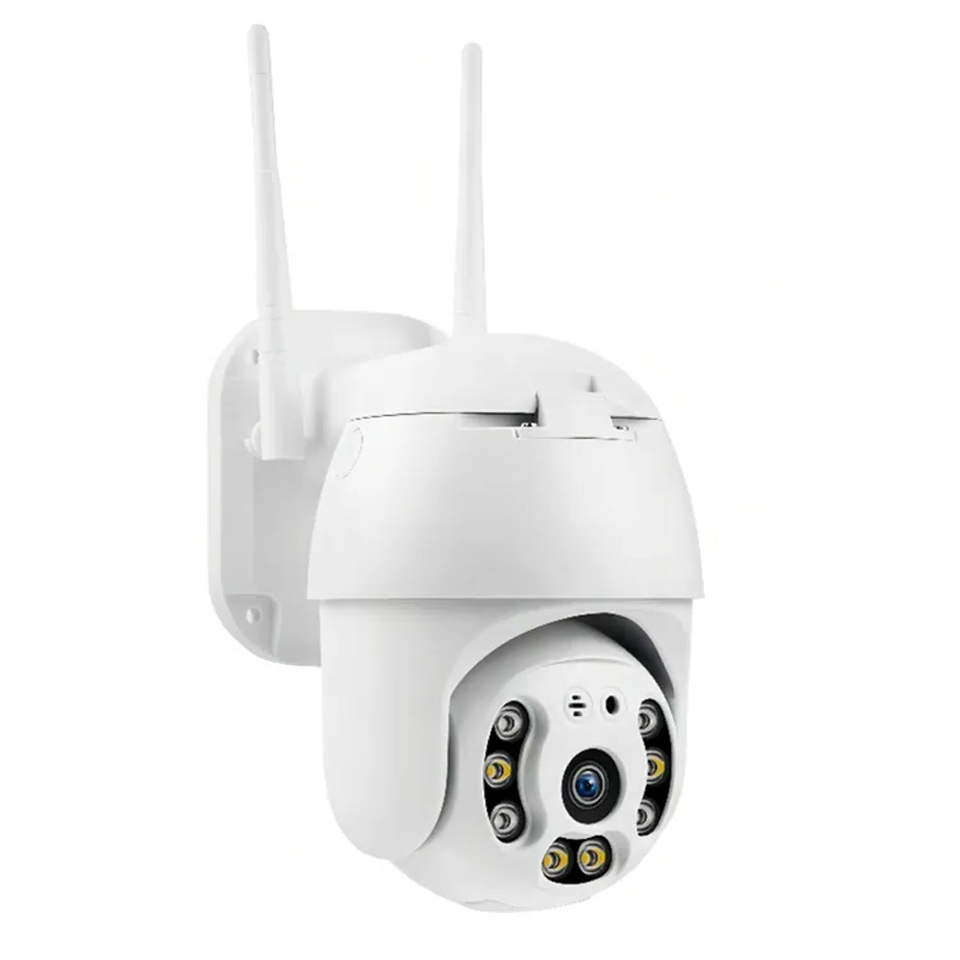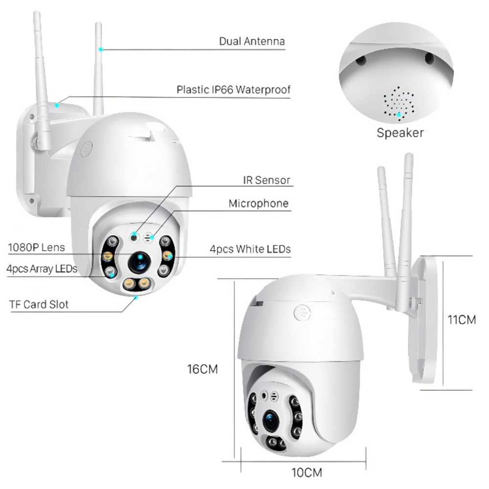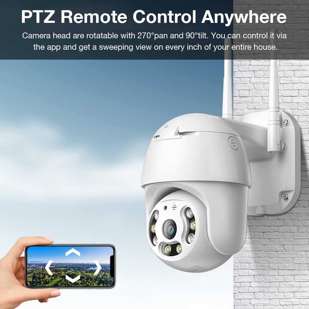-Plug-in/ Wireless Wi-fi surveillance camera Wired power connection, DC 12V adapter. And wireless Wi-Fi network connection, this Wi-Fi camera only supports 2.4G router, does not support 5G. Max distance between the camera and the router is 10~20 feet, within which to sustain the Wi-Fi connection. Two-Way Audio This home security camera embedded with a microphone and a speaker, the surveillance camera makes you to communicate with the outsiders directly. Pan/ Tilt/ Zoom Pan 320 degrees/ tilt 90 degrees (PTZ), this security camera monitors a large area. MicroSD Card Slot/ Cloud Storage The outdoor security camera supports cloud storage and Micro SD card storage (max. 64GB supported Evo, Micro SD card not included). Either way of them you can choose for recording and playback. Motion Detection & Auto Tracking The Wi-Fi camera starts intelligent tracking the moving target when it detects motion on the monitored area. The detection sensitivity is customizable (low/ medium/ high). Smart Smart by auto-lighting: flood light on when detecting motion, the image is in full color, flood light off after 20 seconds since no motion detected, the image is in B/W. IP66 Weatherproof With IP66-rated excellent weatherproof workmanship, the security camera outdoor can work under any tough weather keeping 24/7 recording. Package Include: 1 x Wi-fi PTZ Camera 1 x Adaptor 1 x Manual .